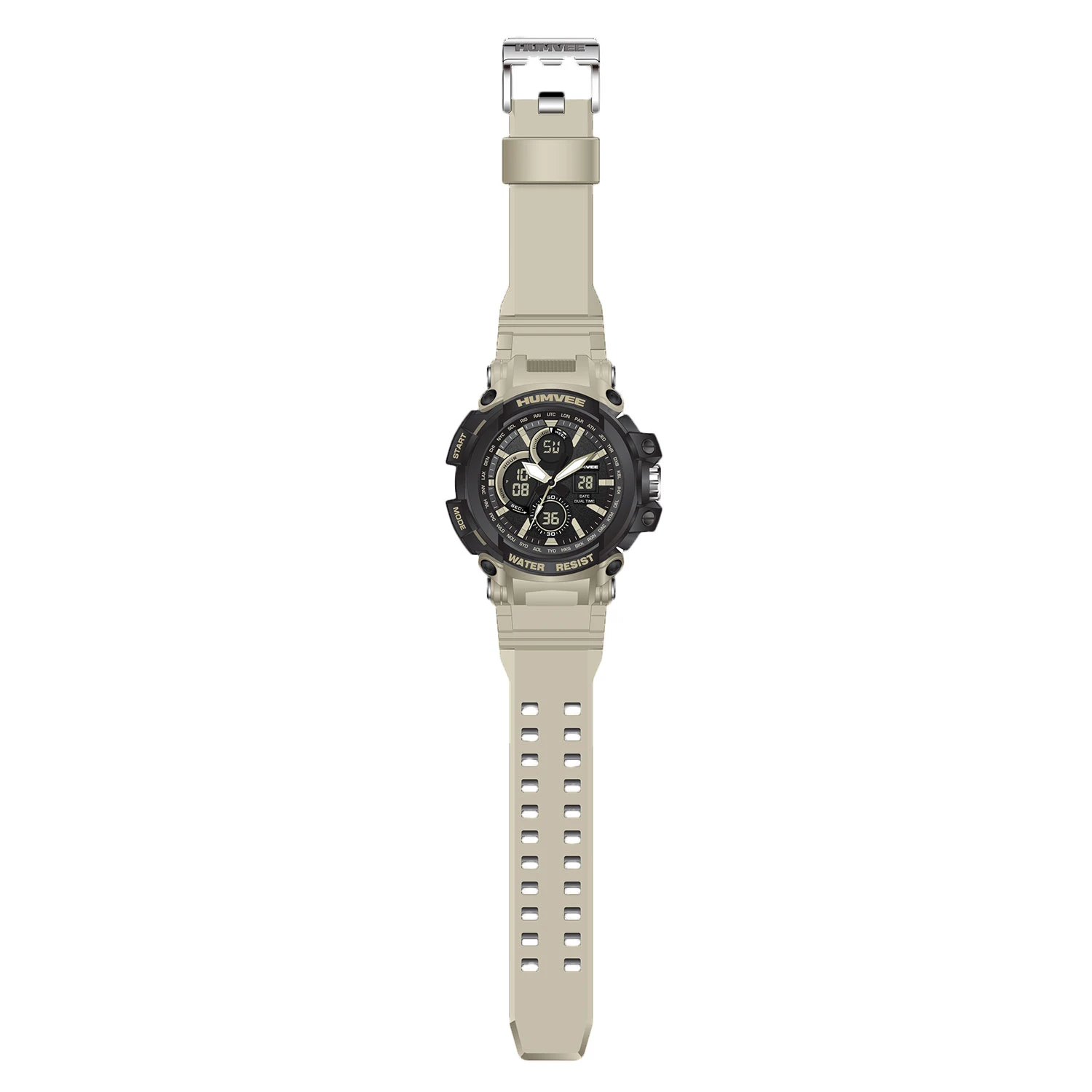 This water-resistant watch by Humvee features a multi-function Analog dial and a Digital display.